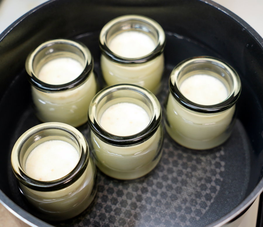 ▼蒸好的布丁拿出來放進冷水中冷卻定型,再拿去冰箱冰起來即可。