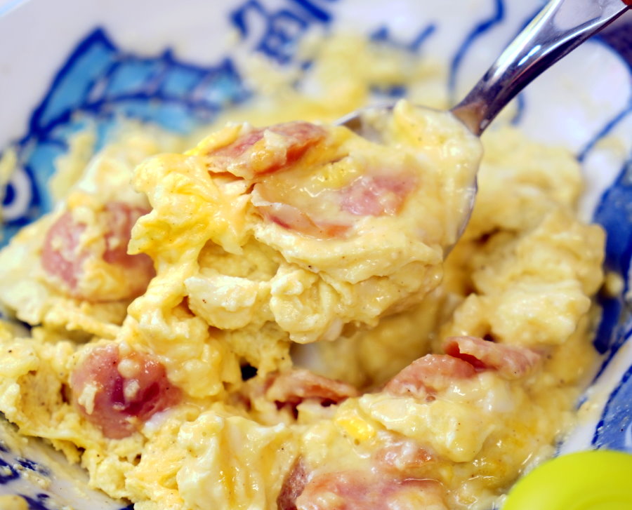 ▼稍微攪拌均勻,就是傳說中的起司熱狗炒蛋啦~吃起來滑嫩帶點微微鹹香,搭配起司的香氣,整個好滿足啊!沒想到炒蛋這麼簡單,連油都不用加,也不用開火、使用平底鍋,按下一鍵就能輕鬆完成,看來以後小口愛的早餐有著落了(笑)。