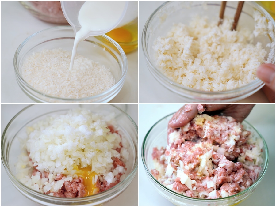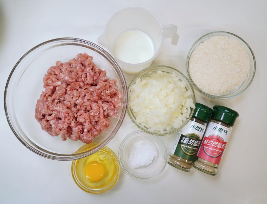 ▼將麵包粉置於容器內再加入牛奶,用手抓捏確認牛奶被麵包粉吸附後,即可放置一旁備用;另外準備一個容器,將豬腳肉、雞蛋、鹽巴、洋蔥黑胡椒粉、白胡椒粉等通通放進去,加入泡過牛奶的麵包粉,再用手把食材抓勻。