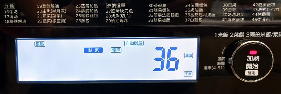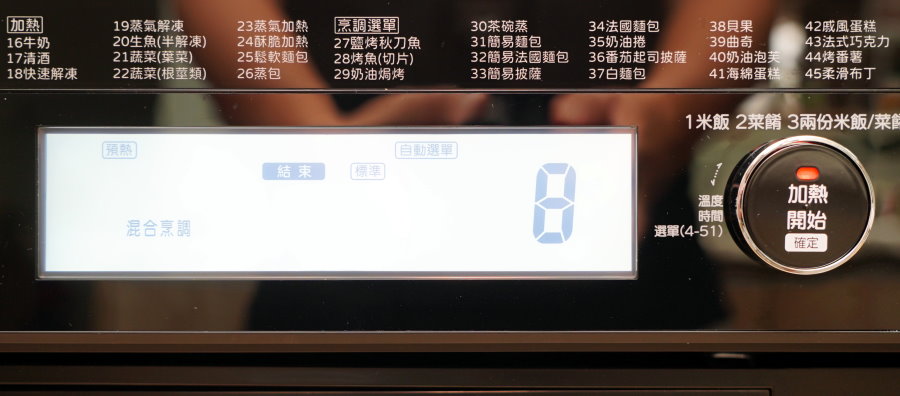 ▼選擇自動選單、設定溫度、時間及加熱小菜、餐點等等都是採用這個旋鈕,選定後再按下中間加熱/開始鍵即可,整體質感也很好;旋鈕同時也有自動微波功能,將食物放入爐內正中間,按下”開始”鍵,一碗米飯的話就可以選擇”1米飯”,其他菜餚就可以選”2菜餚”,加熱超過一種食物以上或兩種溫度不一樣餐點的話,就可以選”3兩份米飯/菜餚”,就會自動偵測並加熱至最佳溫度囉!