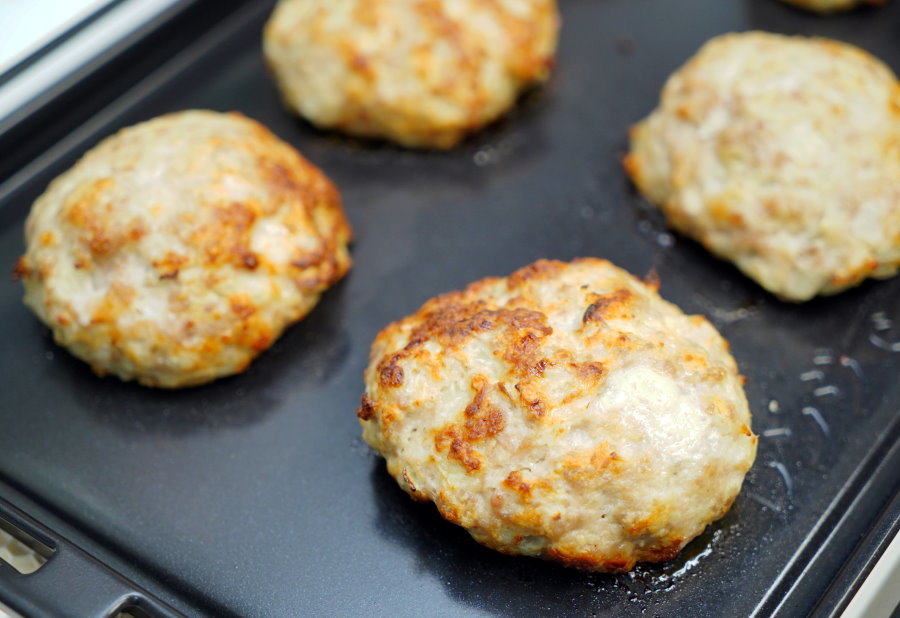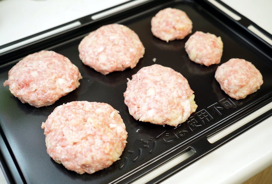 4.將拌好的絞肉捏成5~6顆圓餅狀放在烤盤上,等到預熱完畢將烤盤放在上擱架,按下”開始”鍵即可開始加熱,時間約為19分鐘。