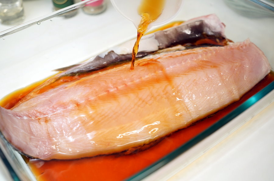1.將魚片置於容器中,加入鰹魚醬油、味醂,醃漬約30分鐘。