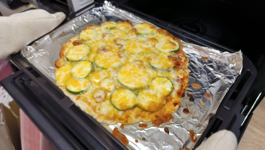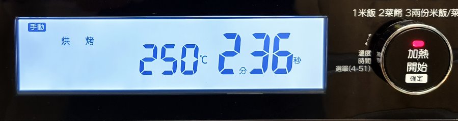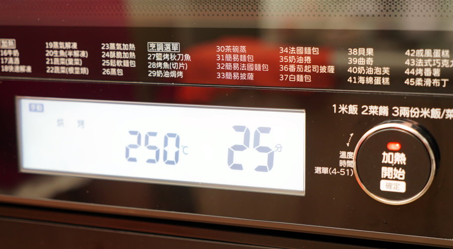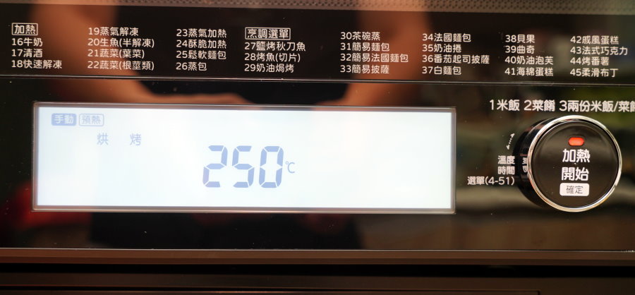 ▼預熱完畢後,裡頭溫度高達250度C,這時放入披薩,按下”開始”鍵,加熱4分30秒就能快速烤完一個披薩,比以前用烤箱還要快許多!