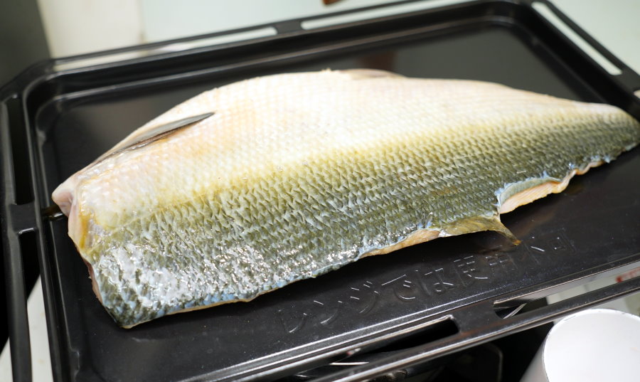 ▼將醃漬好的魚片放至烤盤上,可以看出這條魚有多巨了吧~~~長度跟烤盤快要一樣長啊!