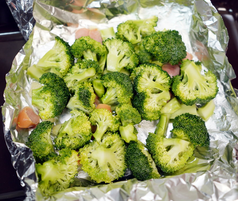 ▼接著我們來挑戰用料理爐還炒蔬菜啦~有時候天氣熱真的不想開火,用這台也能輕鬆搞定!我們將洗淨的花椰菜、熱狗、蒜片放進錫箔紙裡頭,簡單加入一點蒜油、鹽巴、黑胡椒調味,攪拌均勻後就可以包起來囉!