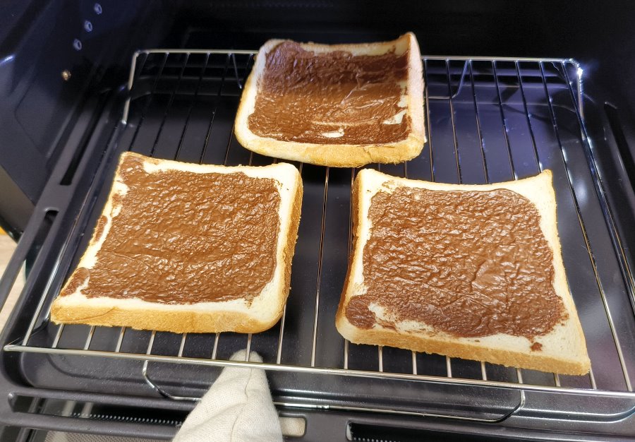 ▼抹上巧克力醬後就可以送進去蒸烤,烤出來的口感酥脆中又帶點微微濕潤,不會過於乾柴,吃起來很剛好!