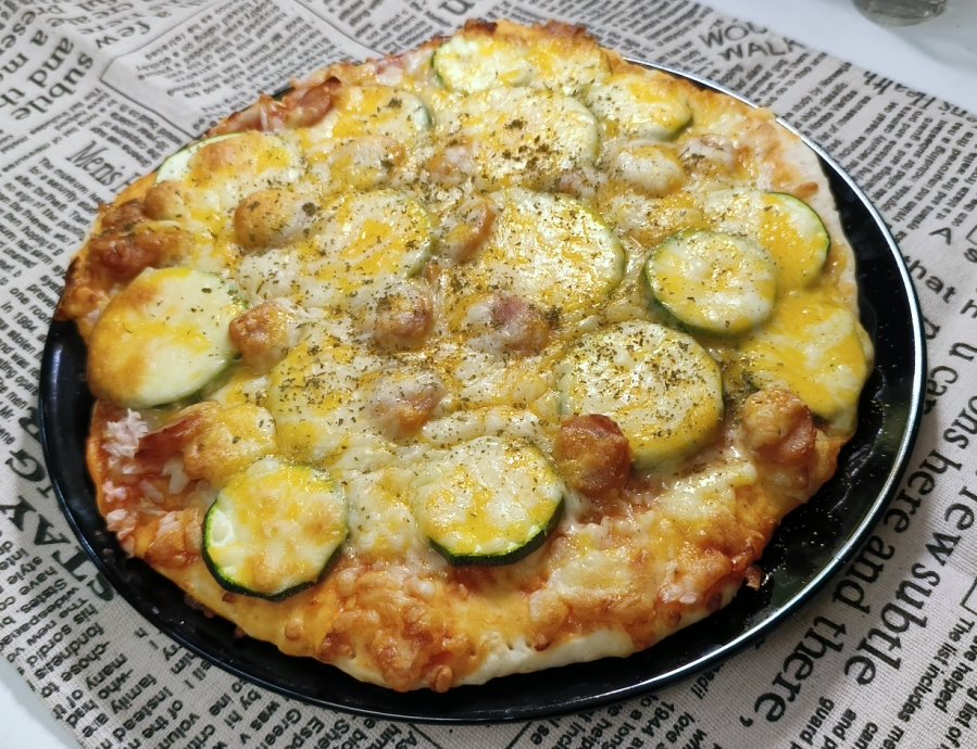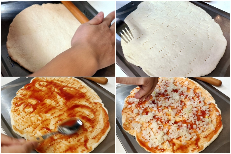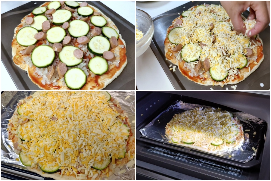 ▼將發酵完的麵團擀成圓形後,再用叉子叉幾個小洞,接著抹上披薩醬(可以自己做或是買現成的披薩醬),鋪上洋蔥、櫛瓜、德國香腸、乳酪絲等配料即可。