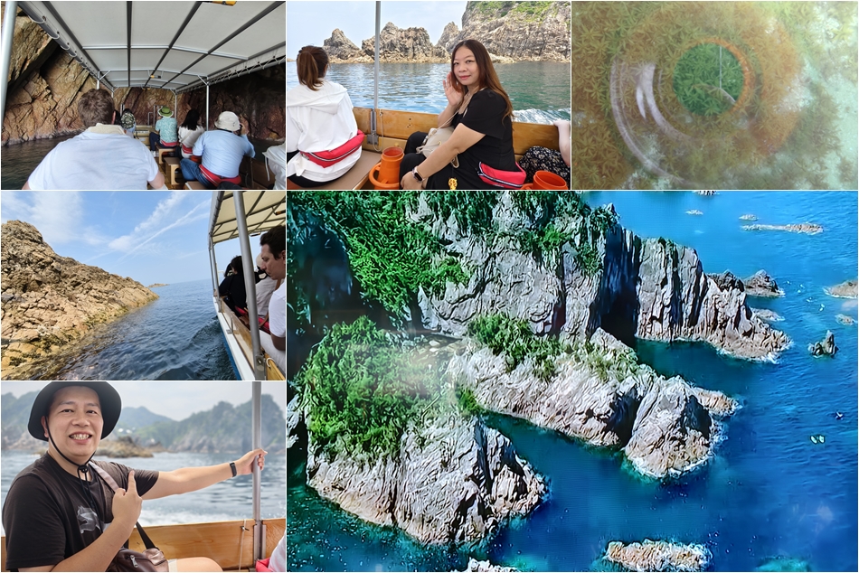 ▼被列為日本百景的浦富海岸,是日本國指定的名勝與天然紀念物,這片長達 15 公里的溺灣海岸,經年累月受到日本海海浪的拍打雕琢,形成了多樣化的洞門、洞窟與純白沙灘。這裡的海水透明度極高,最深可達 25 公尺,天氣晴朗時,海水呈現出夢幻般的清澈透藍,美得令人屏息。我們選擇搭乘小型船「浦富號」,全程約50分鐘。雖然船長的日文介紹聽不太懂,但船上遊客的笑聲不斷,氛圍相當歡樂;小型船最大的優勢,就是能靈活地駛入大型船無法進入的洞門、洞窟和淺江口,讓我們能近距離感受大自然的鬼斧神工。船上還設有水中觀察桶,可以清晰地觀察到色彩斑斕的海底生物,這趟航程不只充滿驚奇,更是視覺與心靈的極致享受。
