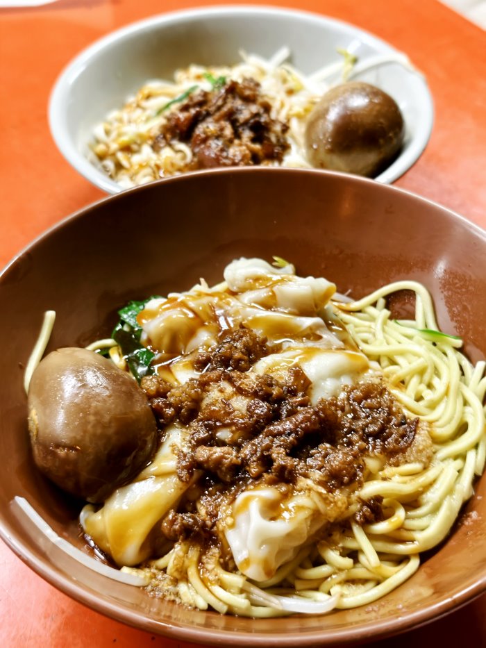 招牌無敵乾麵(油麵)+餛飩上桌,麵條上鋪著迷人的肉燥、爽脆的豆芽菜與韭菜,加顆滷蛋就是最完美的宵夜標配。