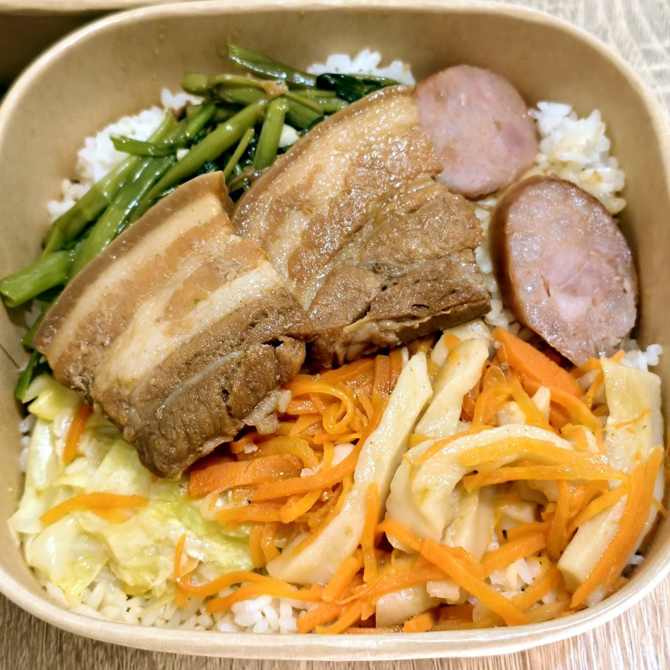 ▼焢肉便當,本來沒打算買焢肉,但聽到前方排隊阿姨熟門熟路的點了焢肉,我們就想說也點一個來試試~~老闆娘會問說需不需要滷汁,這時候一定要立刻說好(笑);當天的配菜是空心菜、高麗菜、紅蘿蔔炒甜不辣,除了空心菜略老一點之外,其他口味都不錯,而且焢肉便當還會多放兩片香腸,吃起來帶點酒香很可以耶!