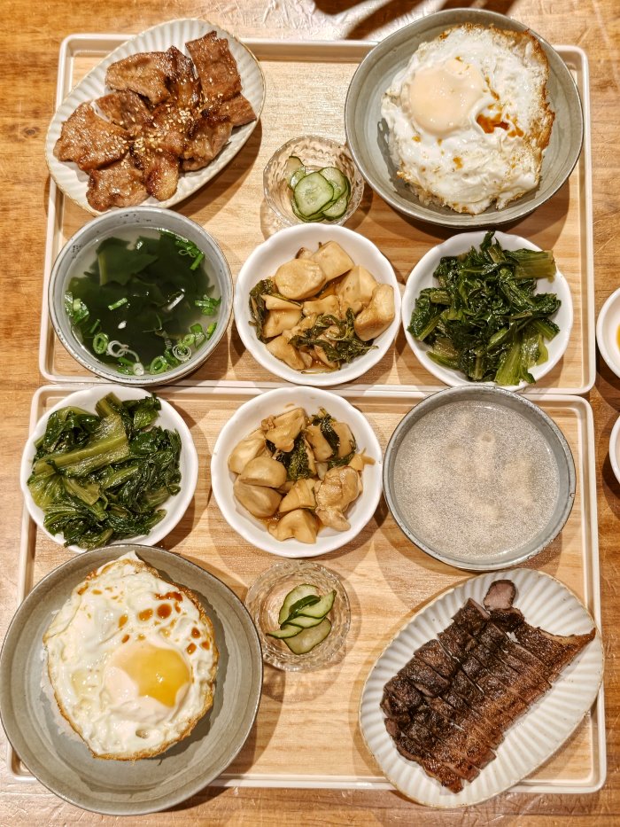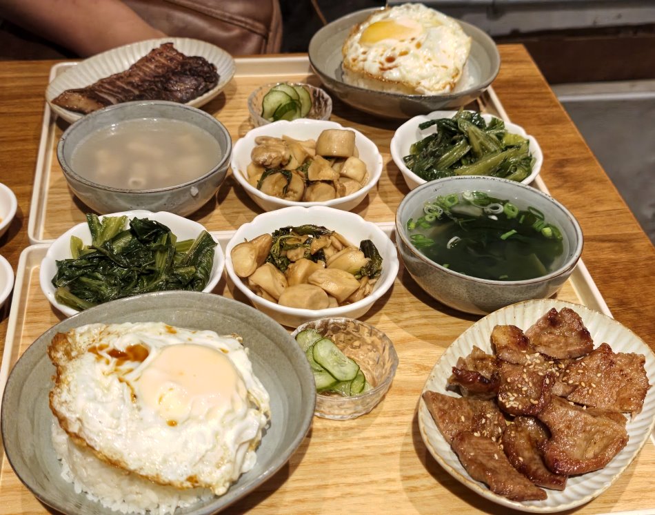 ▼餐點上桌,我們點了鹹豬肉套餐、蒜味梅花燒肉飯套餐,除了主菜之外,還有醃製小黃瓜、半熟蛋、兩樣配菜及每日例湯,也可加價25元換購四神湯。