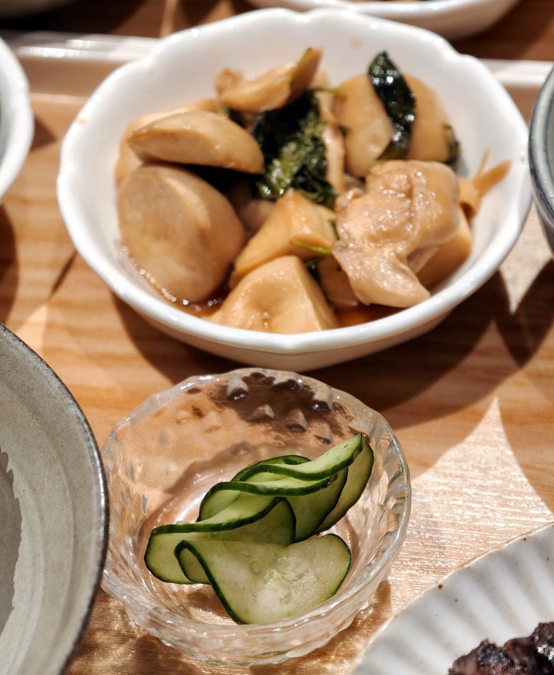 ▼鹽漬小黃瓜酸甜開胃,塔香杏鮑菇Q彈水潤又帶點淡淡的九層塔香氣,都是樸實又耐吃的好味道。
