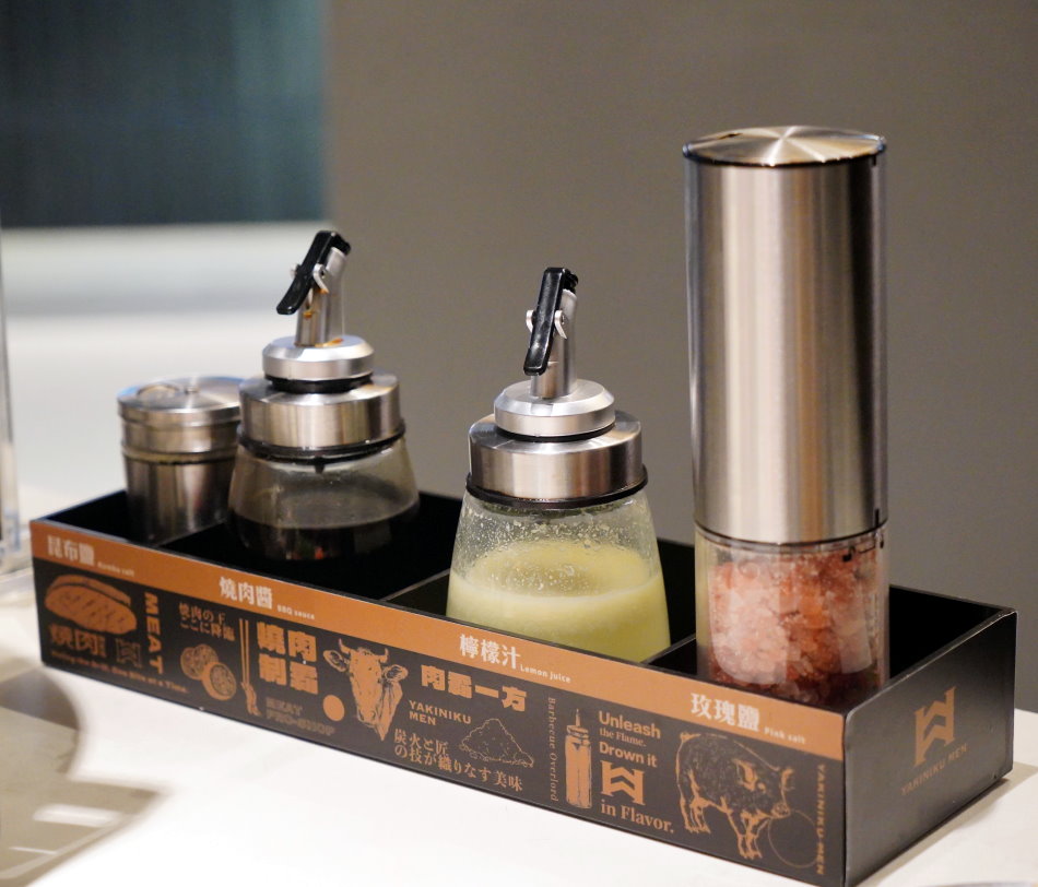 ▼桌上放有玫瑰鹽、檸檬汁、燒肉醬、昆布鹽等四種調味料,其中玫瑰鹽採用自動研磨罐,不用擔心會轉錯邊或一次加太多,用按的更好控制用量。
