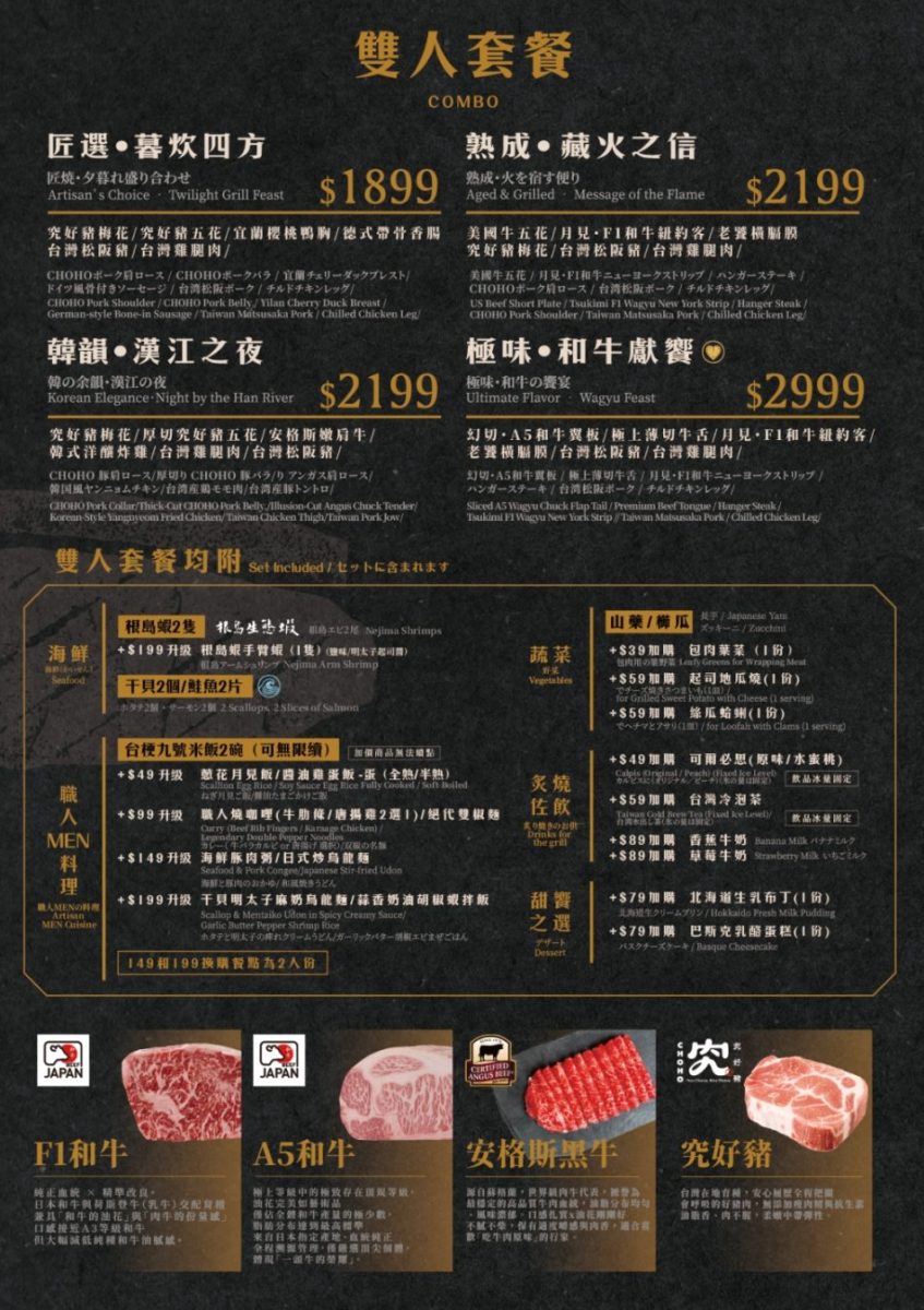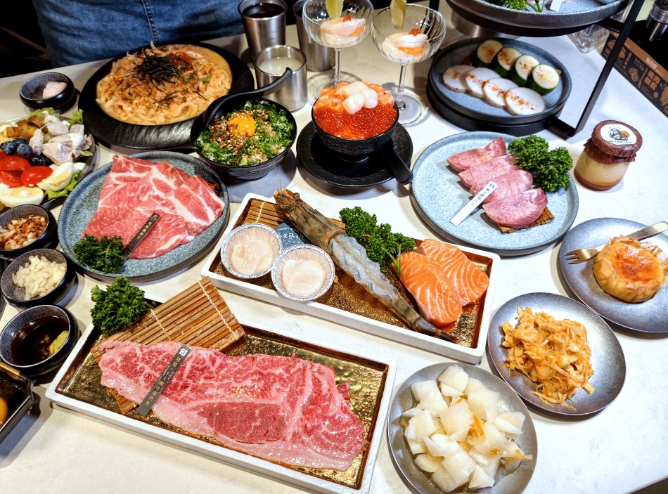 台中燒肉推薦這間來自南投埔里的燒肉MEN朝富店,點套餐就有豐富的沙拉自助吧可以無限享用,提供的還是溫室水耕生菜,還有水煮蛋、雞胸肉、小菜及多款優質水果,根本就是高蛋白沙拉吧無誤;另外也有飲料、冰沙、哈根達斯、霜淇淋通通讓你吃到飽,個人套餐最低499元起就能享用,還有雞湯無限續,難怪平日來也是人潮滿滿,真的是太超值啦!這裡還有雙人套餐可供點選,不管是F1和牛、A5和牛、安格斯黑牛、究好豬都能點得到,海鮮、主食、甜點都很有水準,來一趟就能吃得滿足又開心。