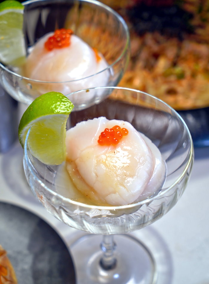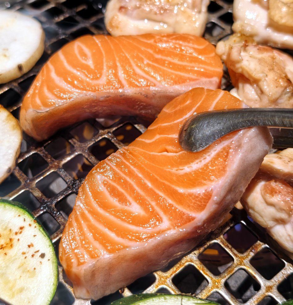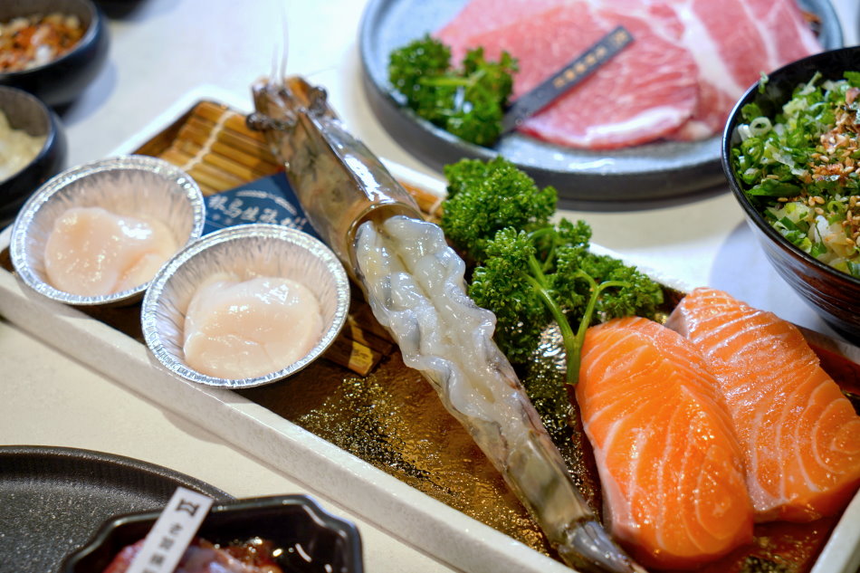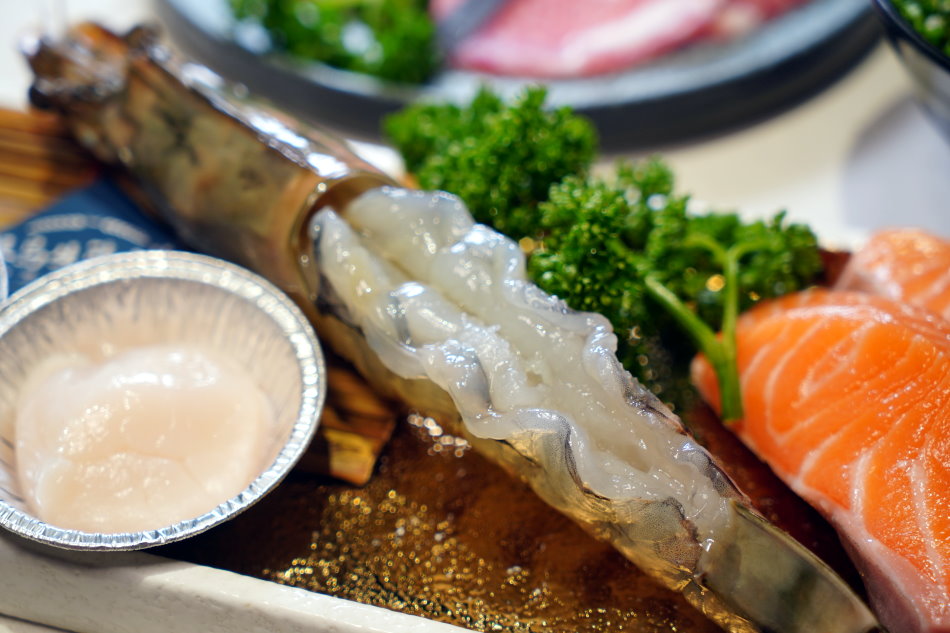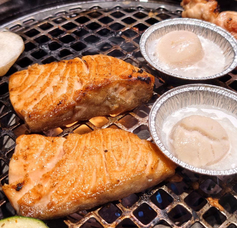 ▼鮭魚根本媲美餐廳點的鮭魚排,肥嫩飽滿又帶有迷人的油脂香氣,好吃到不行;干貝可以直接放上烤網,或是像我們一樣加點雞湯進去一起烤,吃起來更水潤鮮香,口感也是柔嫩到不行,非常推薦。