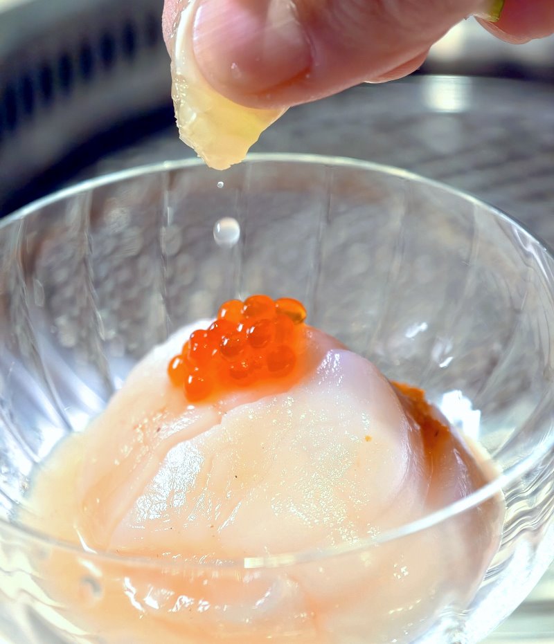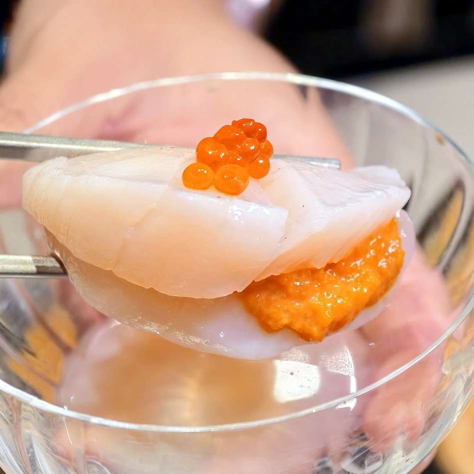 ▼干貝漢堡非常不得了,不是那種可以一口塞進嘴裡的尺寸,一口咬下,先是吃到肥嫩鮮美的干貝,搭配綿密甘甜的海膽、微鹹爆漿的鮭魚卵,整個層次非常多元。