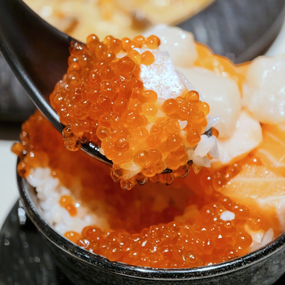 ▼鮮嫩肥美的鮭魚、爆漿鹹香的鮭魚卵、柔嫩甘甜的干貝在嘴裡一起迸發,整個鮮味滿滿,搭配米飯更是讓人一口接一口,吃起來好滿足啊!