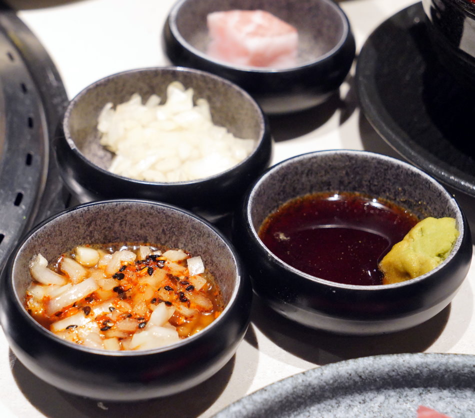 ▼除了桌上的調味料之外,店家還會附上豬油塊、洋蔥、辣洋蔥,海鮮丼飯則是會附上山葵醬油,都可以視個人喜愛搭配肉品享用。