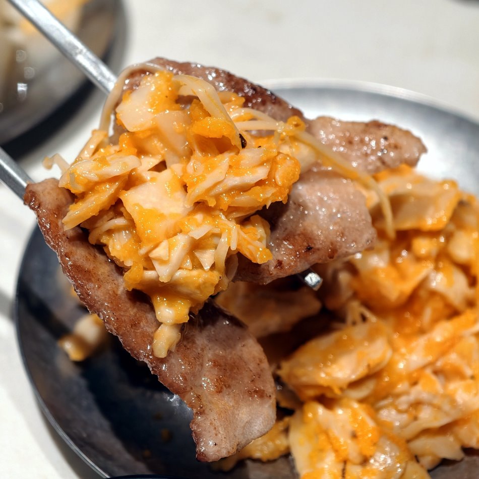 ▼究好豬梅花不管是搭配辣洋蔥或是黃金泡菜菇都相當開胃解膩,吃起來清爽Q彈又回甘。