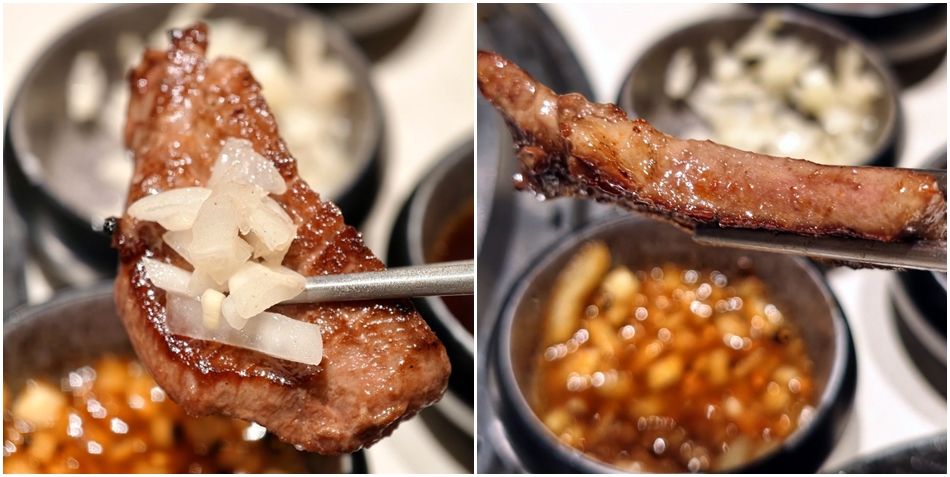 ▼橫膈膜吃起來軟嫩中帶點嚼感,肉香濃郁、彈牙多汁,在嘴裡咀嚼起來非常享受,搭配辣洋蔥更清爽解膩。