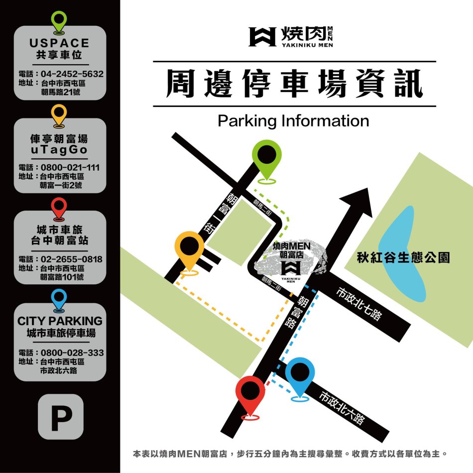 ▼燒肉MEN朝富店附近有不少路邊車格,也有多個付費停車場,店家也很貼心提供停車場資訊給大家參考!