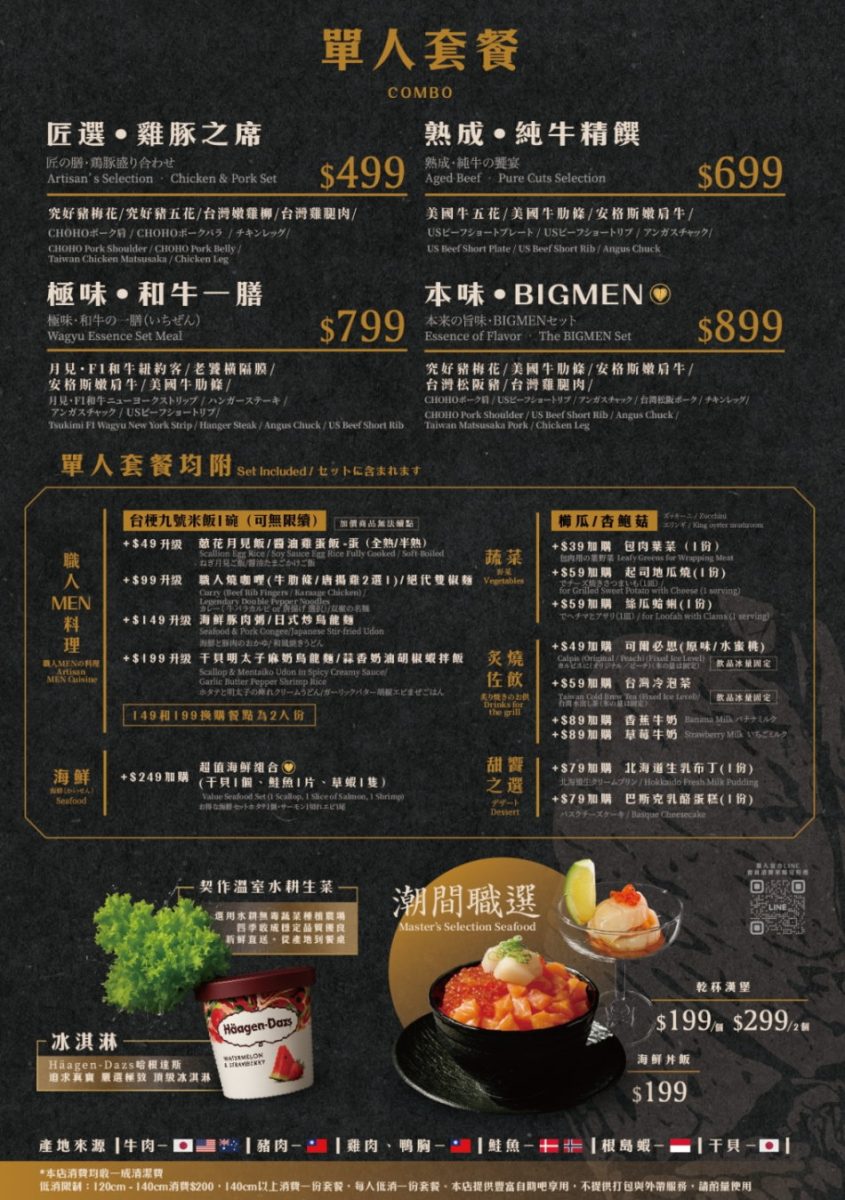 ▼菜單,個人套餐最低只要499元就能享用到主餐及自助吧,自助吧包含水耕生菜高蛋白沙拉吧、飲品、冰沙、哈根達斯、霜淇淋等通通無限享用,真的很超值;另外還有雙人套餐、各式單點,選擇還不少~~這裡的低消為120~140公分200元,140公分以上消費一份套餐,提供給大家參考。