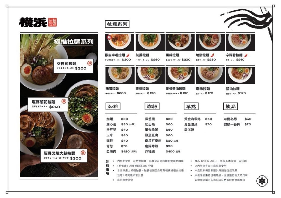 ▼菜單,這裡的拉麵170元起跳,還能享有第一次免費加麵服務~~另外也有結合在地特色的筊白筍拉麵,吃起來也很特別;這裡還有提供炸物、單點、飲品,有需要的朋友都可以點起來。