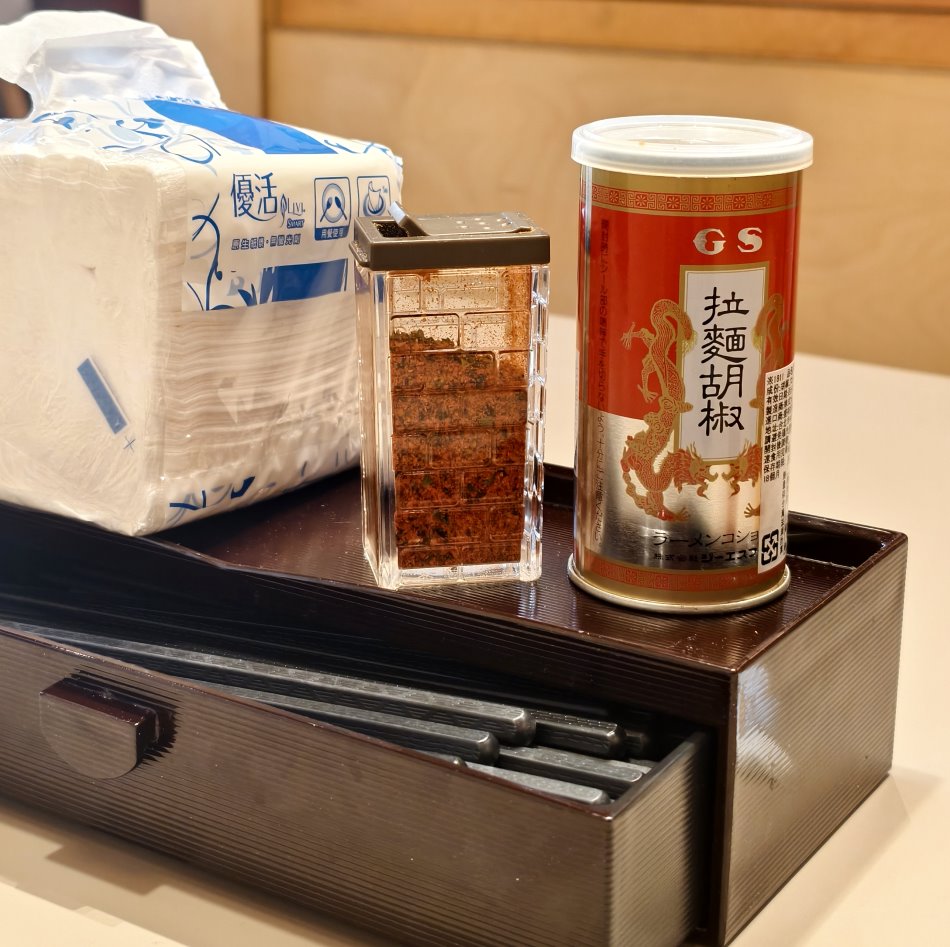 ▼桌上還有拉麵胡椒、七味粉、餐具、紙巾等,方便大家取用。