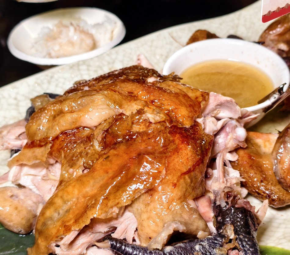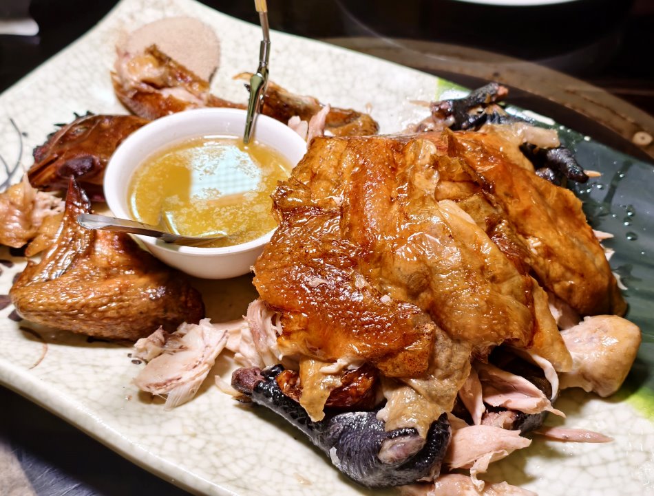 ▼甕缸雞(全隻),採用嚴選黑羽正土雞,以筍乾、梅乾菜為基底烘烤40分鐘,以原汁原味方式呈現;最特別的是這裡提供全台首創手剝甕缸雞服務,通通幫你貼心去骨,不怕燙手、不用沾手就能品嘗到甕缸雞的美味!另外還有牌子提醒大家雞油是拿來拌飯的,千萬不要只拿來沾雞肉享用,拌飯更邪惡啊!