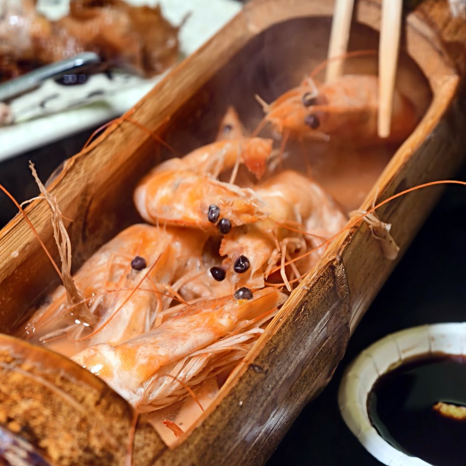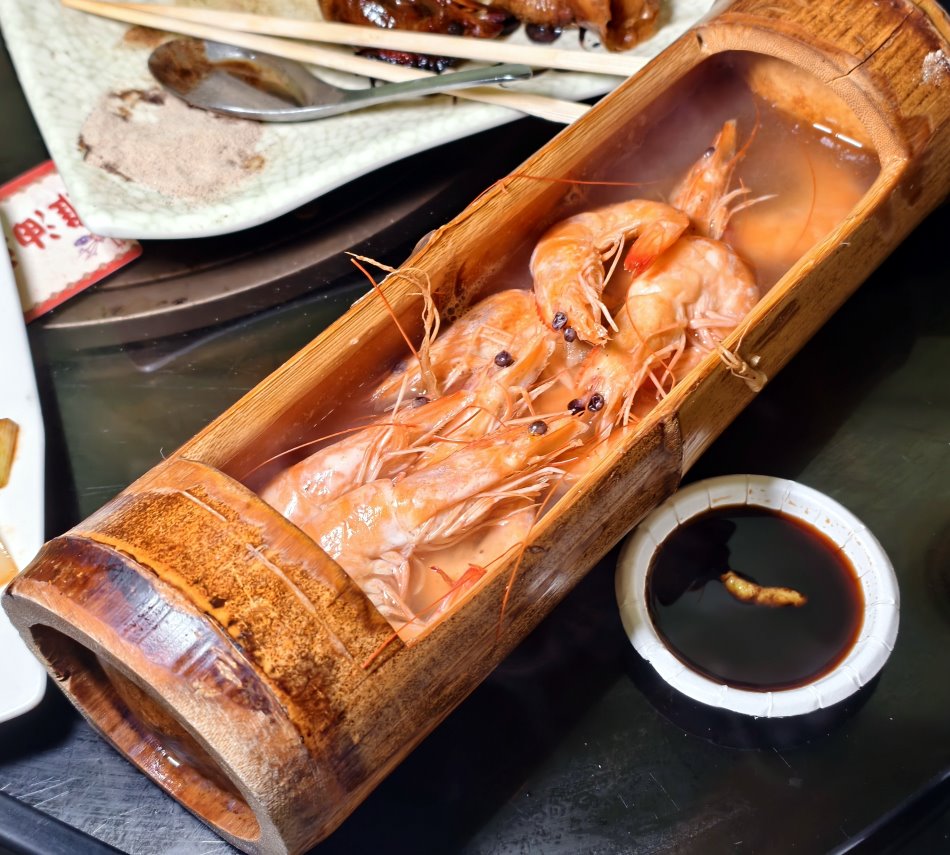 ▼人蔘竹筒蝦,這道竹筒蝦採用人蔘、紅棗、當歸、枸杞等藥材下去烹煮而成,不僅有淡雅甘甜的藥膳香氣,搭配Q彈鮮美的蝦子相當合拍。