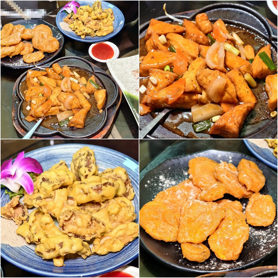 ▼鐵板豆腐,以鐵板上桌更能維持熱度,豆腐香嫩飽滿,搭配黑胡椒醬汁與洋蔥、蔥段等配料下去拌煮,香滑嫩口又入味;酥炸香菇,吃起來外酥內多汁,簡單搭配胡椒鹽就很美味!酥炸地瓜,這道是由店家招待,吃起來外酥內綿密,帶有地瓜濃郁的香甜,搭配甘梅粉更是酸甜夠味。
