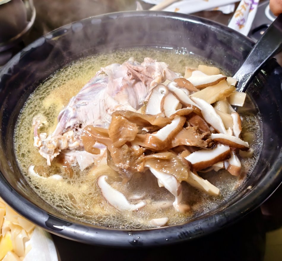 ▼香菇雞油脆筍湯,點全雞就送這鍋湯真的很划算;採用甕缸雞的雞架搭配福菜、茄苳葉、香菇、脆筍等下去熬煮,喝起來既有炭烤過的雞香味,搭配梅菜的香氣、爽脆的竹筍與雞油香味,溫潤甘甜又順口。